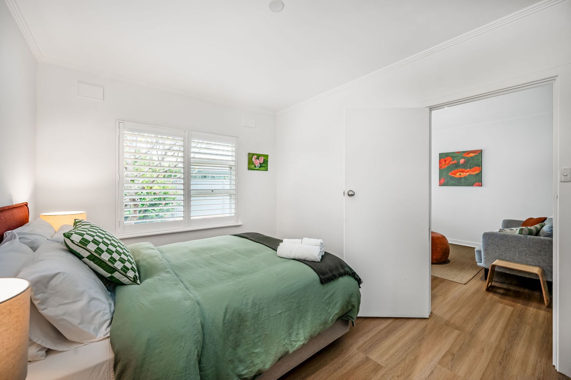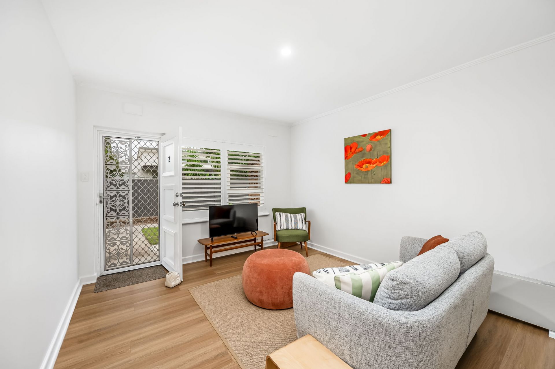 When you arrive you'll be greeted by a small private group of mid-century units. On Street parking available for guests to use across and down the street. The unit has been tastefully refurbished with consistent, easy on the eye neutral colour tones carried throughout, incorporating modern living area, split system cycle air conditioning and comfortable bedroom accommodation with a queen sized bed.