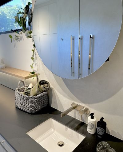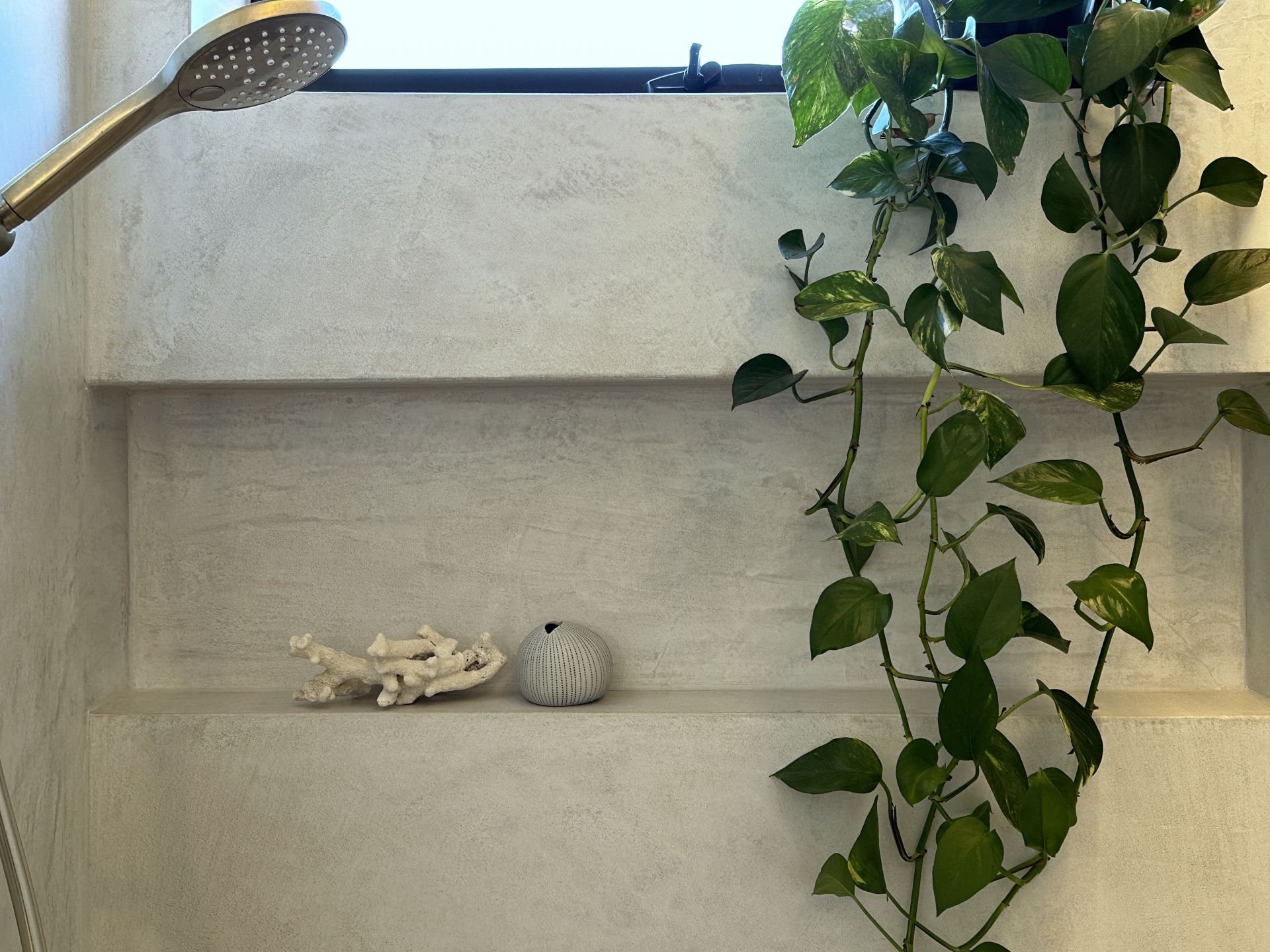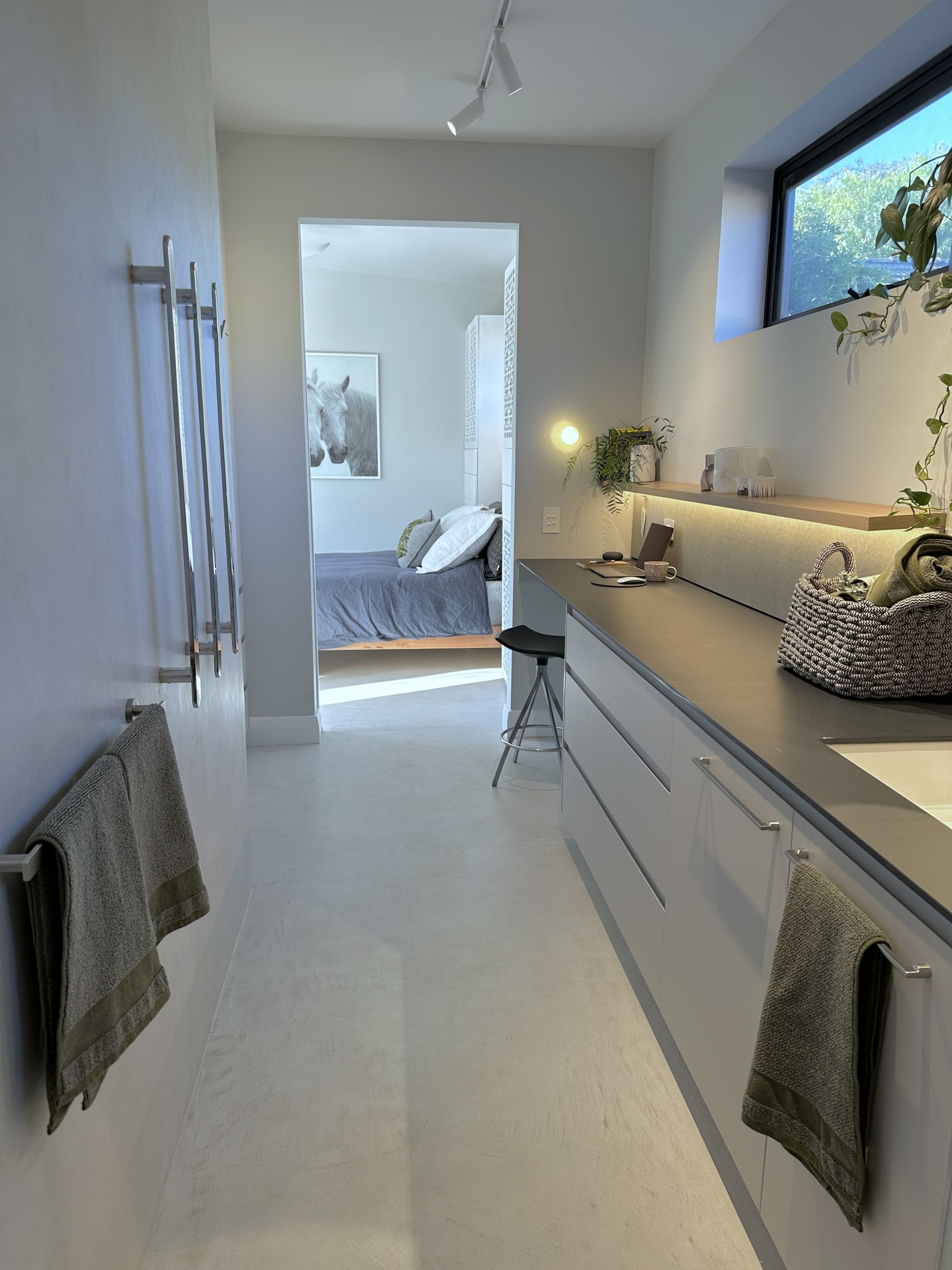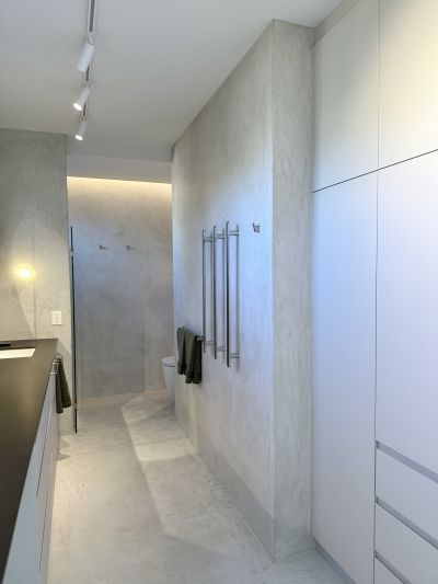 The large light filled bathroom with walk in shower wet room, advanced microcrete flooring & walls eliminates all tiling.