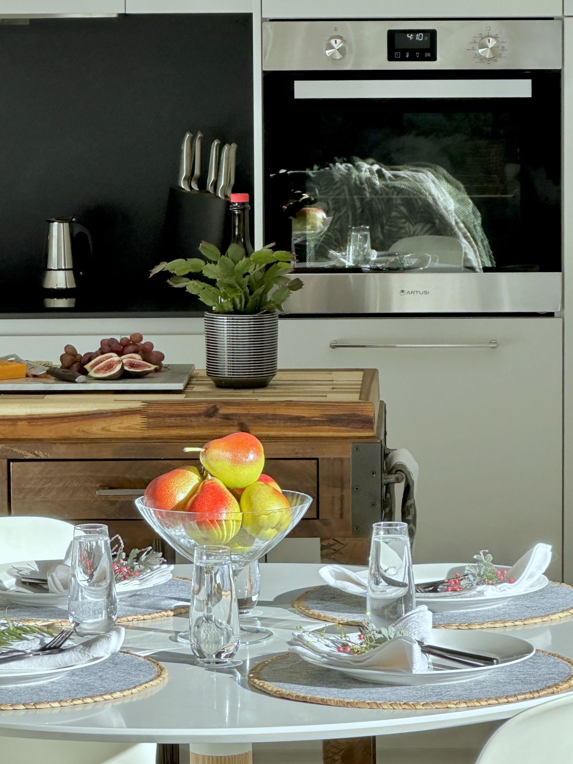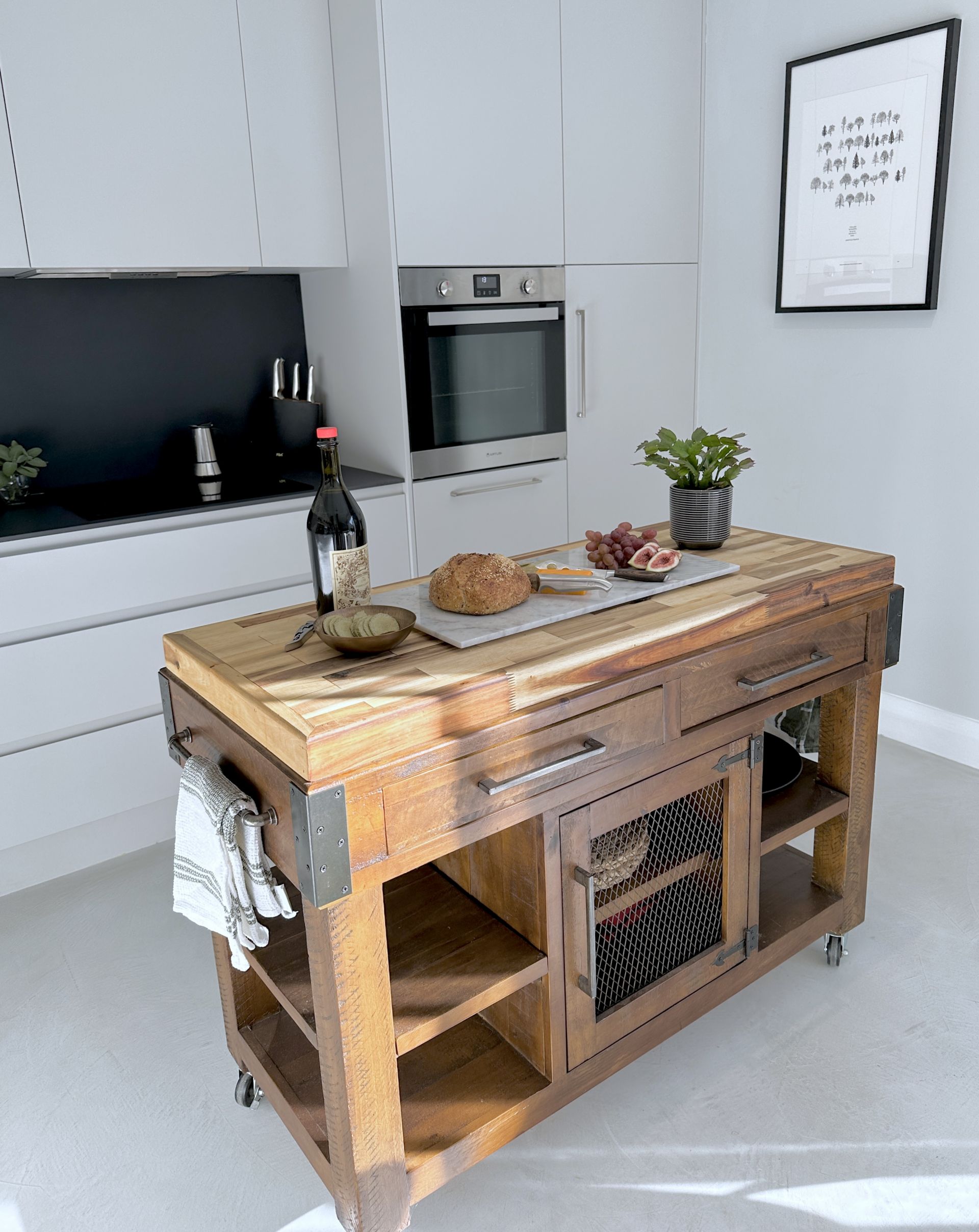 A mobile butchers block island bench movable to allow for a flexible floor plan.