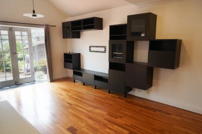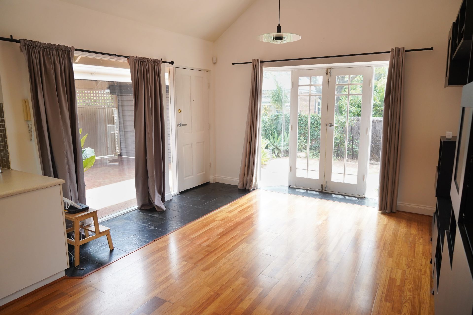 - Large open plan living/dining area with timber floorboards